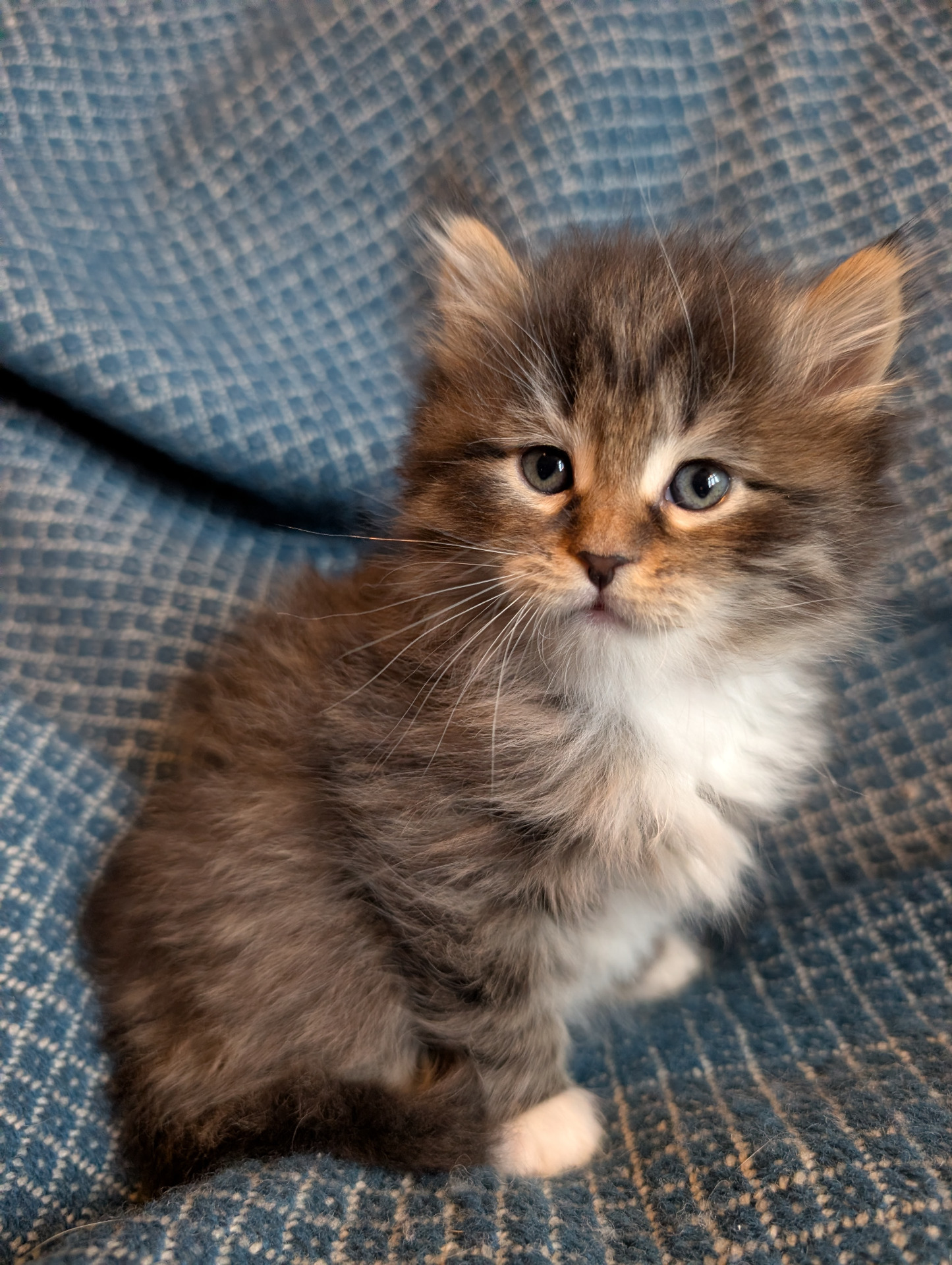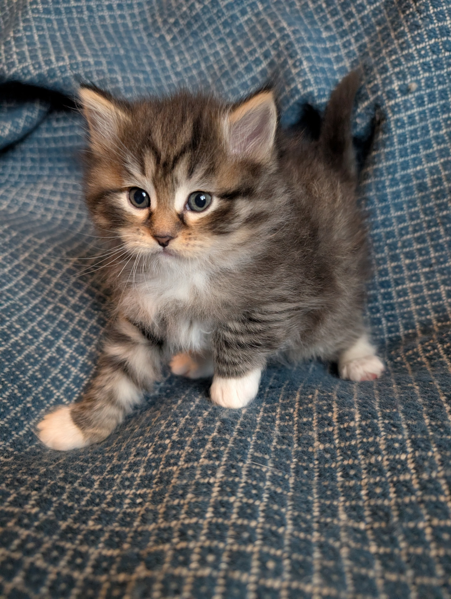 Småostarna har börjat äta storkattsmat och har sedan en vecka tillbaka kommit underfund med vad havregrynslådan är till för. Med Pecorino som härförare har de också frigjort sig från bolådan och huserar nu fritt i vardagsrummet. Soffan är toppen. Att jaga varandra runt hela golvet likaså. Alla tre är nyfikna, sociala och mysiga. Ett fantastiskt litet gäng! Nedan är de på rad Cheddar, Stilton och Pecorino.